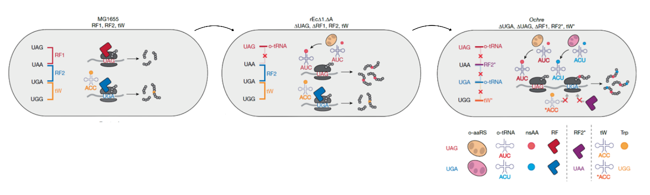 Los investigadores reemplazaron de forma sistemática 1 195 codones UGA por UAA en todo el genoma de E. coli, obteniendo un organismo viable cuya traducción dependía exclusivamente del codón UAA como señal de parada. Para consolidar esta reorganización, se modificaron elementos esenciales de la maquinaria traduccional, entre ellos el factor de liberación RF2 y el tRNA^Trp, de manera que se eliminara el reconocimiento nativo de UGA como codón de terminación. Como consecuencia, se generó un sistema en el que UAA actúa como el único codón de parada, mientras que UAG y UGA quedaron libres para ser utilizados con funciones alternativas.